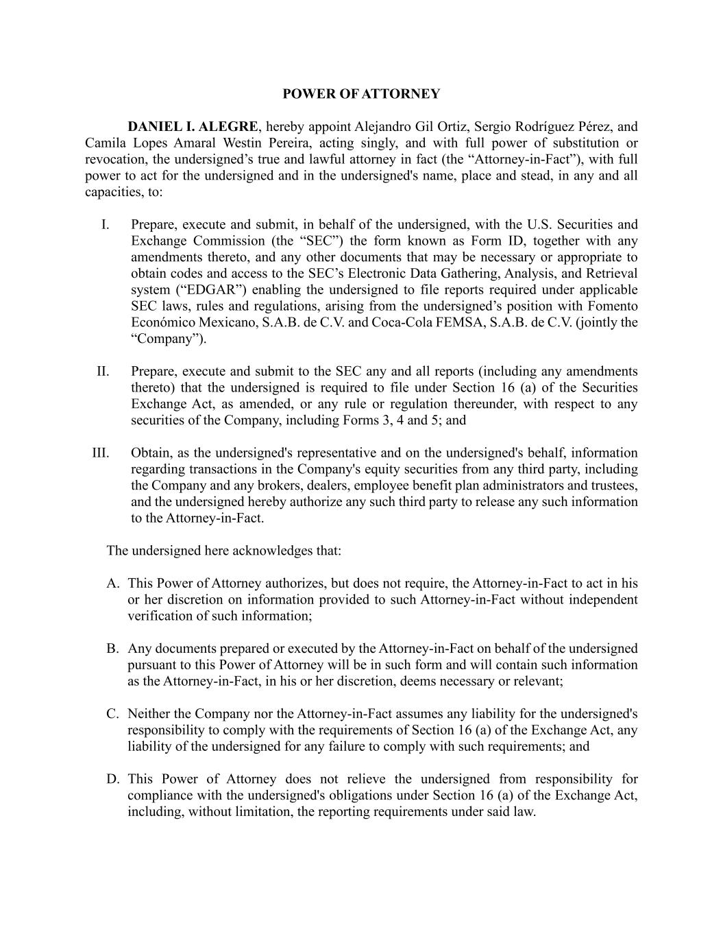POWER OF ATTORNEY DANIEL I. ALEGRE, hereby appoint Alejandro Gil Ortiz, Sergio Rodríguez Pérez, and Camila Lopes Amaral Westin Pereira, acting singly, and with full power of substitution or revocation, the undersigned’s true and lawful attorney in fact (the “Attorney-in-Fact”), with full power to act for the undersigned and in the undersigned's name, place and stead, in any and all capacities, to: I. Prepare, execute and submit, in behalf of the undersigned, with the U.S. Securities and Exchange Commission (the “SEC”) the form known as Form ID, together with any amendments thereto, and any other documents that may be necessary or appropriate to obtain codes and access to the SEC’s Electronic Data Gathering, Analysis, and Retrieval system (“EDGAR”) enabling the undersigned to file reports required under applicable SEC laws, rules and regulations, arising from the undersigned’s position with Fomento Económico Mexicano, S.A.B. de C.V. and Coca-Cola FEMSA, S.A.B. de C.V. (jointly the “Company”). II. Prepare, execute and submit to the SEC any and all reports (including any amendments thereto) that the undersigned is required to file under Section 16 (a) of the Securities Exchange Act, as amended, or any rule or regulation thereunder, with respect to any securities of the Company, including Forms 3, 4 and 5; and III. Obtain, as the undersigned's representative and on the undersigned's behalf, information regarding transactions in the Company's equity securities from any third party, including the Company and any brokers, dealers, employee benefit plan administrators and trustees, and the undersigned hereby authorize any such third party to release any such information to the Attorney-in-Fact. The undersigned here acknowledges that: A. This Power of Attorney authorizes, but does not require, the Attorney-in-Fact to act in his or her discretion on information provided to such Attorney-in-Fact without independent verification of such information; B. Any documents prepared or executed by the Attorney-in-Fact on behalf of the undersigned pursuant to this Power of Attorney will be in such form and will contain such information as the Attorney-in-Fact, in his or her discretion, deems necessary or relevant; C. Neither the Company nor the Attorney-in-Fact assumes any liability for the undersigned's responsibility to comply with the requirements of Section 16 (a) of the Exchange Act, any liability of the undersigned for any failure to comply with such requirements; and D. This Power of Attorney does not relieve the undersigned from responsibility for compliance with the undersigned's obligations under Section 16 (a) of the Exchange Act, including, without limitation, the reporting requirements under said law.